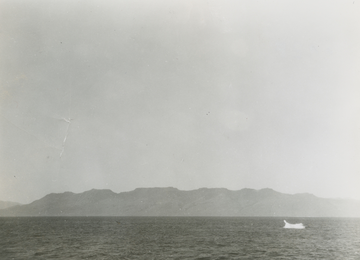 Fotografi från expedition till Östgrönland 1929. Dansk-svensk expedition under ledning av Lauge Koch. Svenska deltagare: Oscar Kulling och Helge Backlund. Vy över hav, berg och litet isberg.