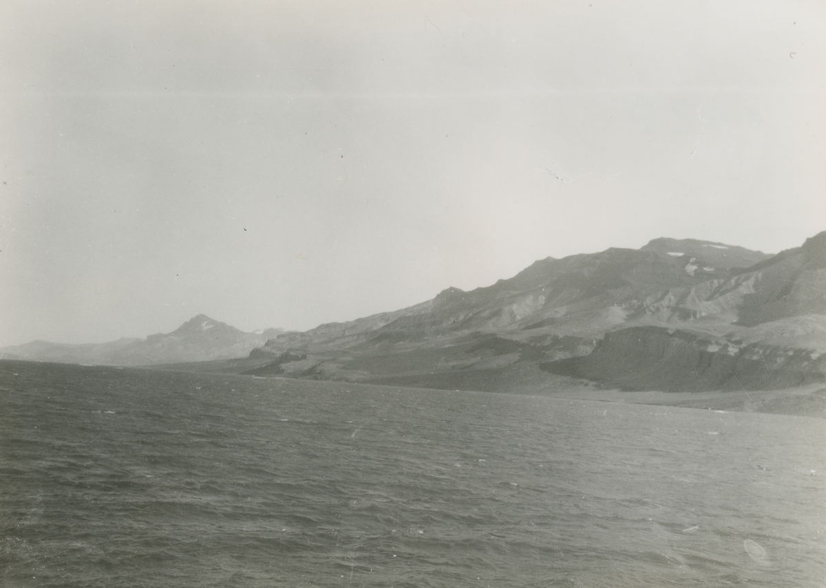 Fotografi från expedition till Östgrönland 1929. Dansk-svensk expedition under ledning av Lauge Koch. Svenska deltagare: Oscar Kulling och Helge Backlund. Vy över hav och berg.