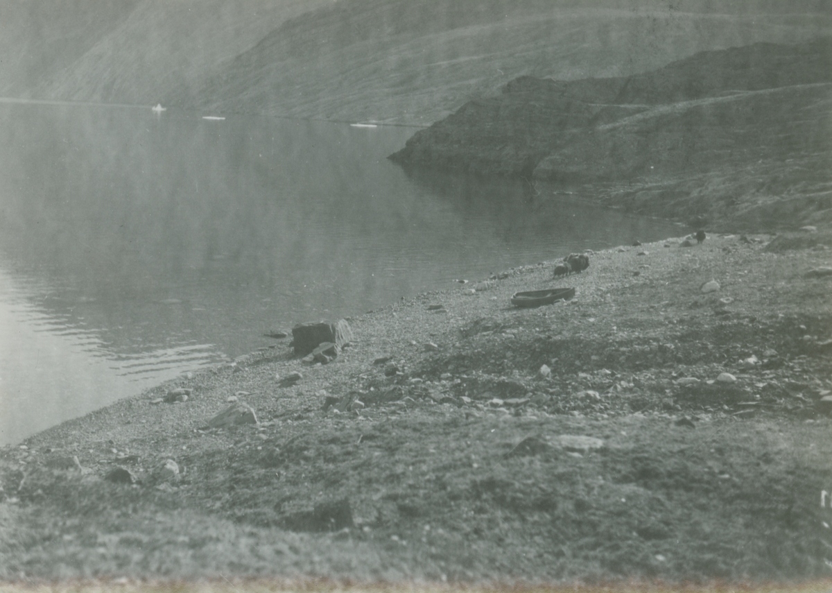 Fotografi från expedition till Östgrönland 1929. Dansk-svensk expedition under ledning av Lauge Koch. Svenska deltagare: Oscar Kulling och Helge Backlund. Motiv av strand vid vatten nedanför berg.
