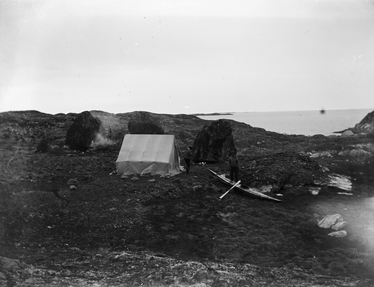 Fotografi från Grönland. Motiv av tält i bergslandskap.