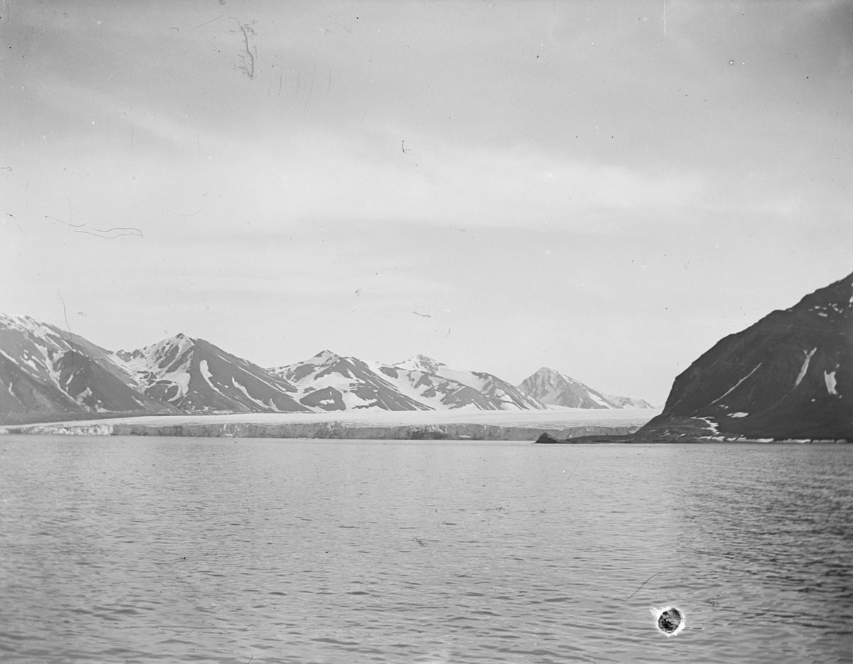 Fotografi från Grönland. Vy över hav och snötäckta berg.