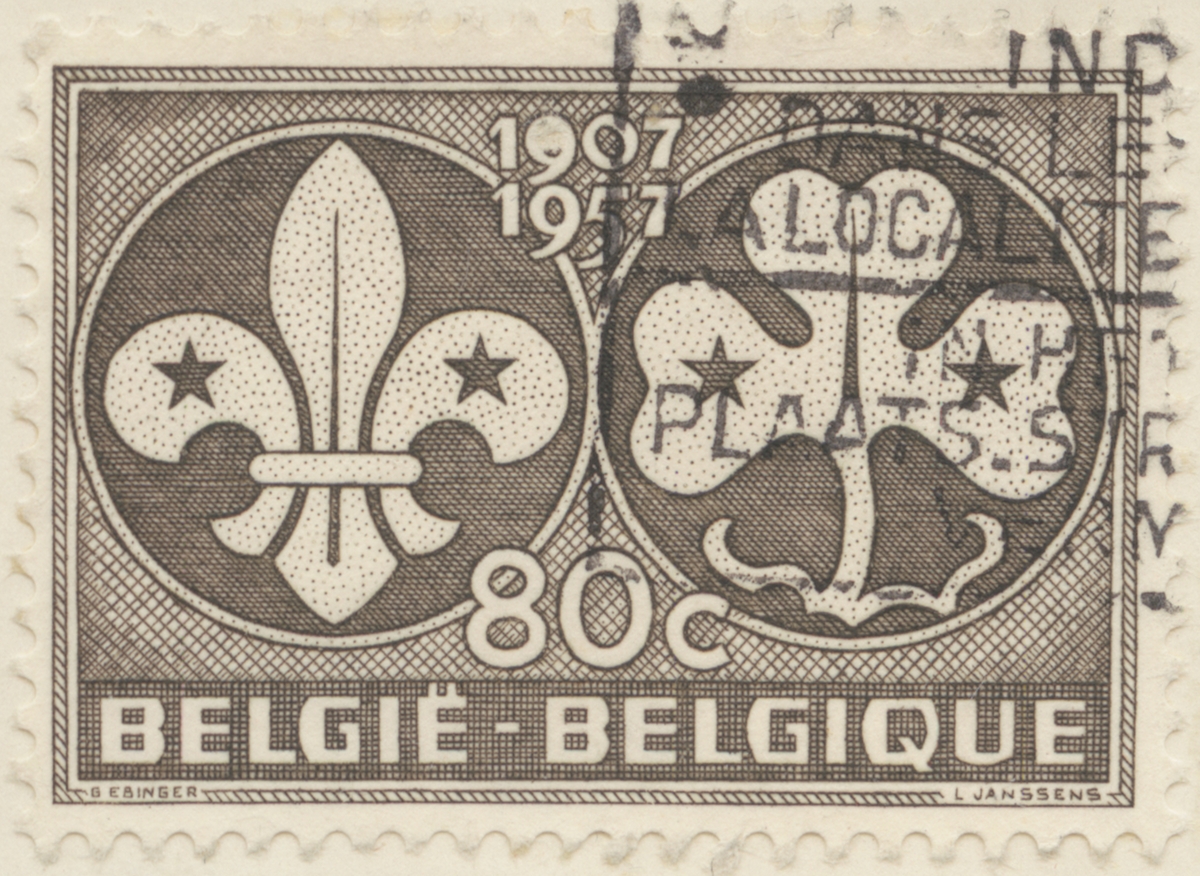 Frimärke från Belgien, 1957. Motiv av Scout Tecken Scoutrörelsen 50 år: 1907-1957 och 100-årsminne av Lord Baden-Powells födelse: som grundade scoutrörelsen 1857-1957.