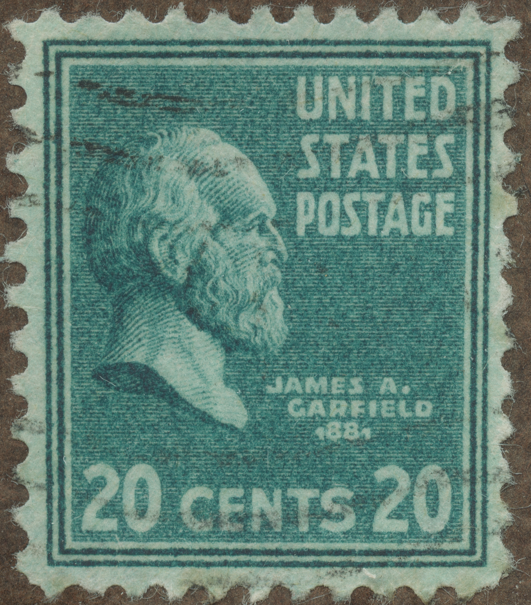 Frimärke från U.S.A., 1938. Motiv av James A. Garfield 1831-1881 Professor Rektor General President 1881