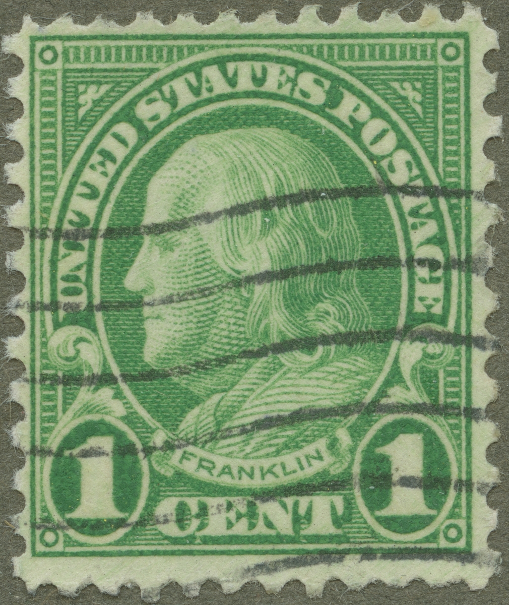 Frimärke från U.S.A., 1923. Motiv av Benjamin Franklin 1706-1790. Amerikansk statsman. Fysiker: Luftelektriciteten. Åskledaren 1752. Impulsen till brandkår, gatstensbeläggning, gatubelysning m.m.