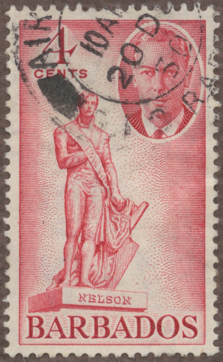 Frimärke från Barbados, 1950. Motiv av Staty över sjöhjälten Viscount Horatio Nelson: 1758-1805. Engelsk amiral. (ovan t.h.) Kung George VI-