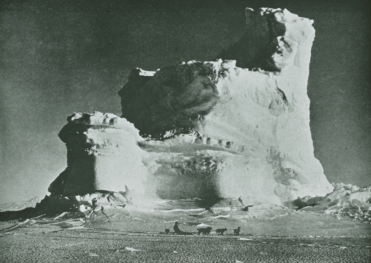 Fotografi med motiv av stort isberg. I förgrunden syns man med hundspann.
