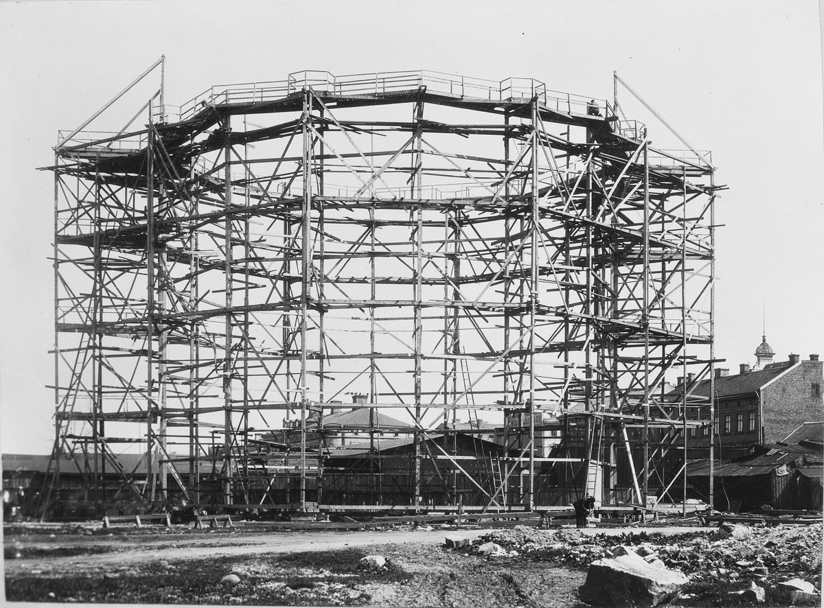 S.A Andrées ballonghus uppställt på försök i Göteborg 1896. Original tillhör Ingenjör James Sandberg, Stockholm.
