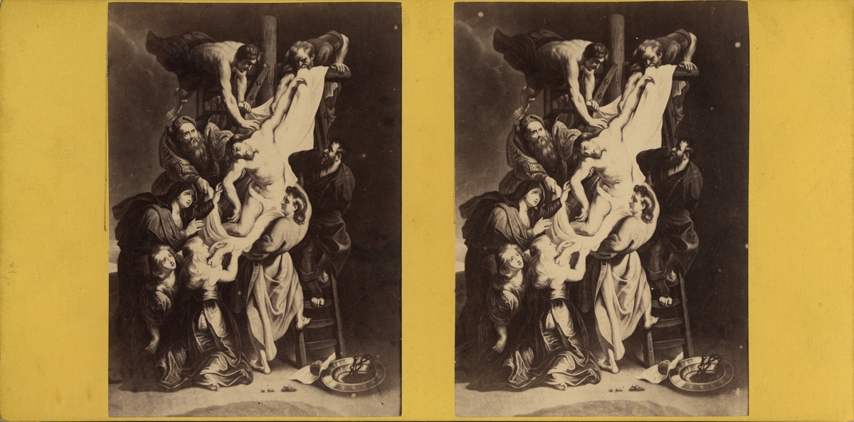 Stereobild med religiöst motiv, Jesus tas ner från korset.