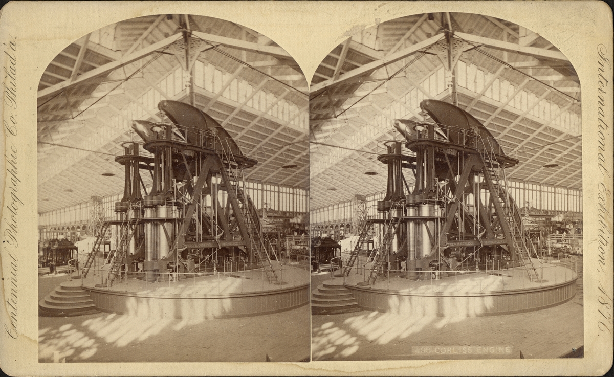 Stereobild av motor, Corliss Engine, Centennial International Exhibition 1876.