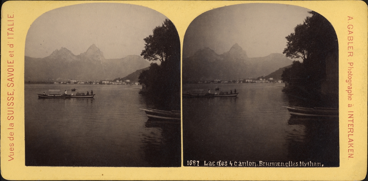 Stereobild av båtar på sjön "Lac des 4 Canolon, Brunnenefles Mythen".