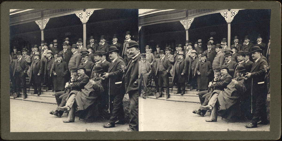 Stereobild av välklätt större manligt sällskap, på veranda.