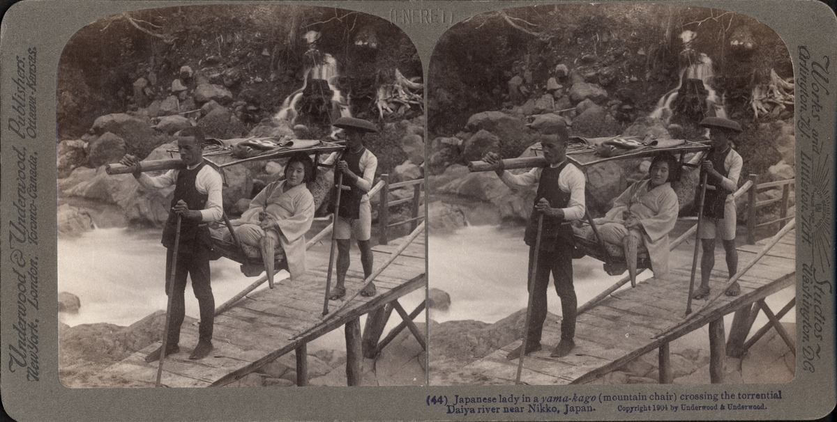 Stereobild av japansk kvinna buren av två män i bergsstol, yama-kago, på liten träbro över Daiya River i närheten av Nikko.