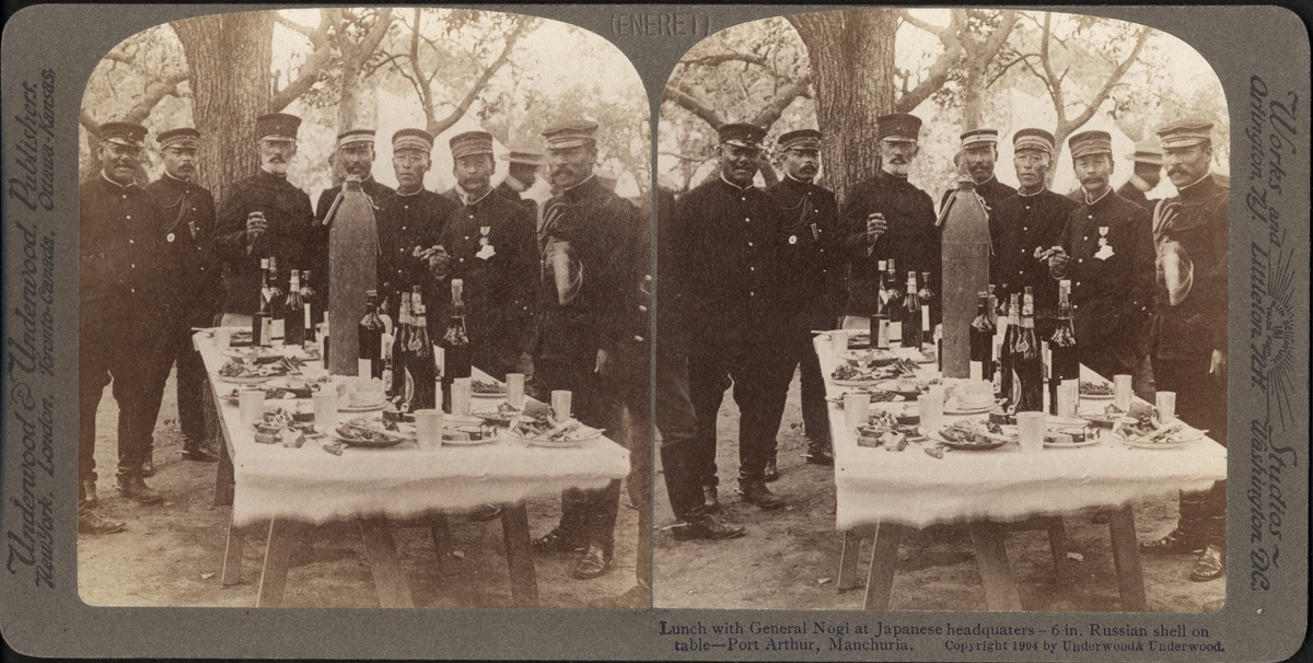 Stereobild, lunch med General Nogi vid de Japanska högkvarteret, med en Rysk bomb på bordet, Port Arthur (senare Lüshunkou).
