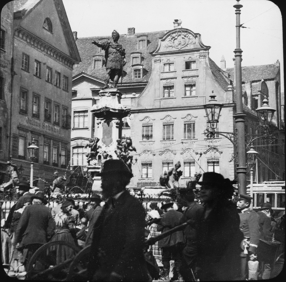 Skioptikonbild med motiv av folkvimmel kring Augustbrunnen, fontän i Augsburg.
