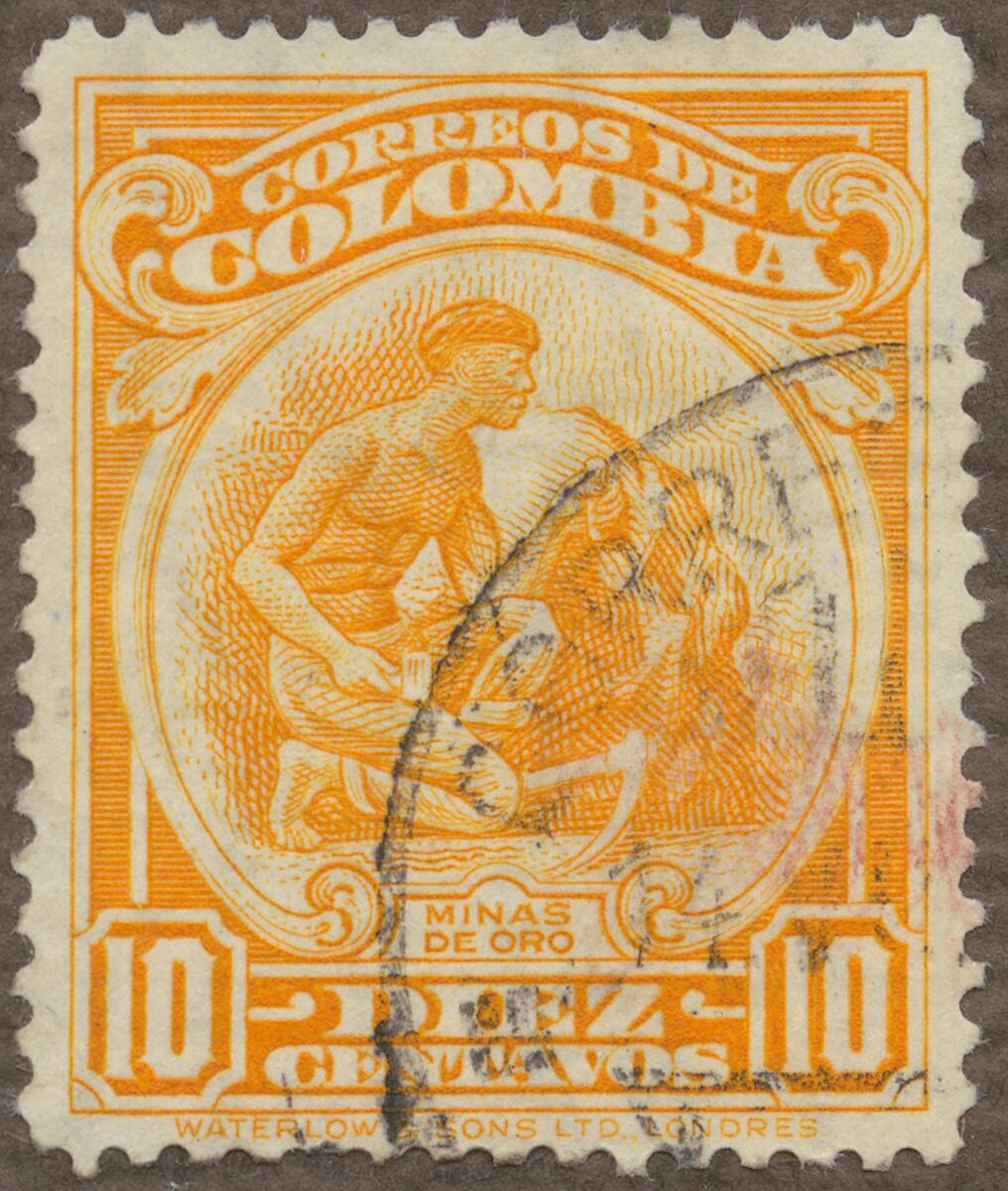 Frimärke från Colombia, 1932. Motiv av Guldvaskning i Colombia, Sydamerika.