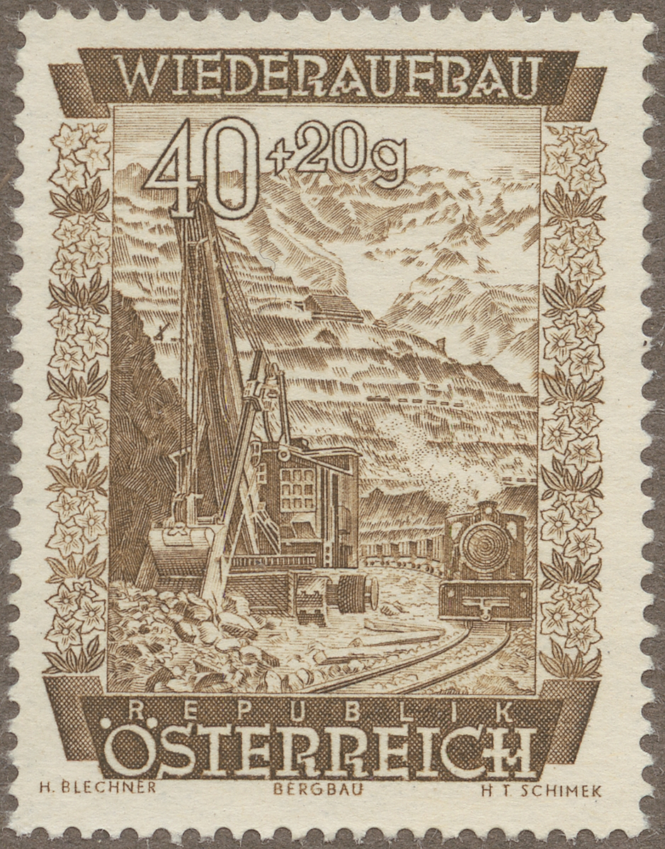Frimärke från Österrike, 1948. Motiv av Dagbrytning i pallar av järnmalm. Steiermark i Österrike 1948. Eisenerzalperna.