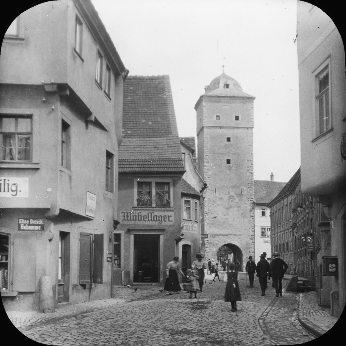 Skioptikonbild med motiv från Ochsenfurt med Oberes Tor i bakgrunden.