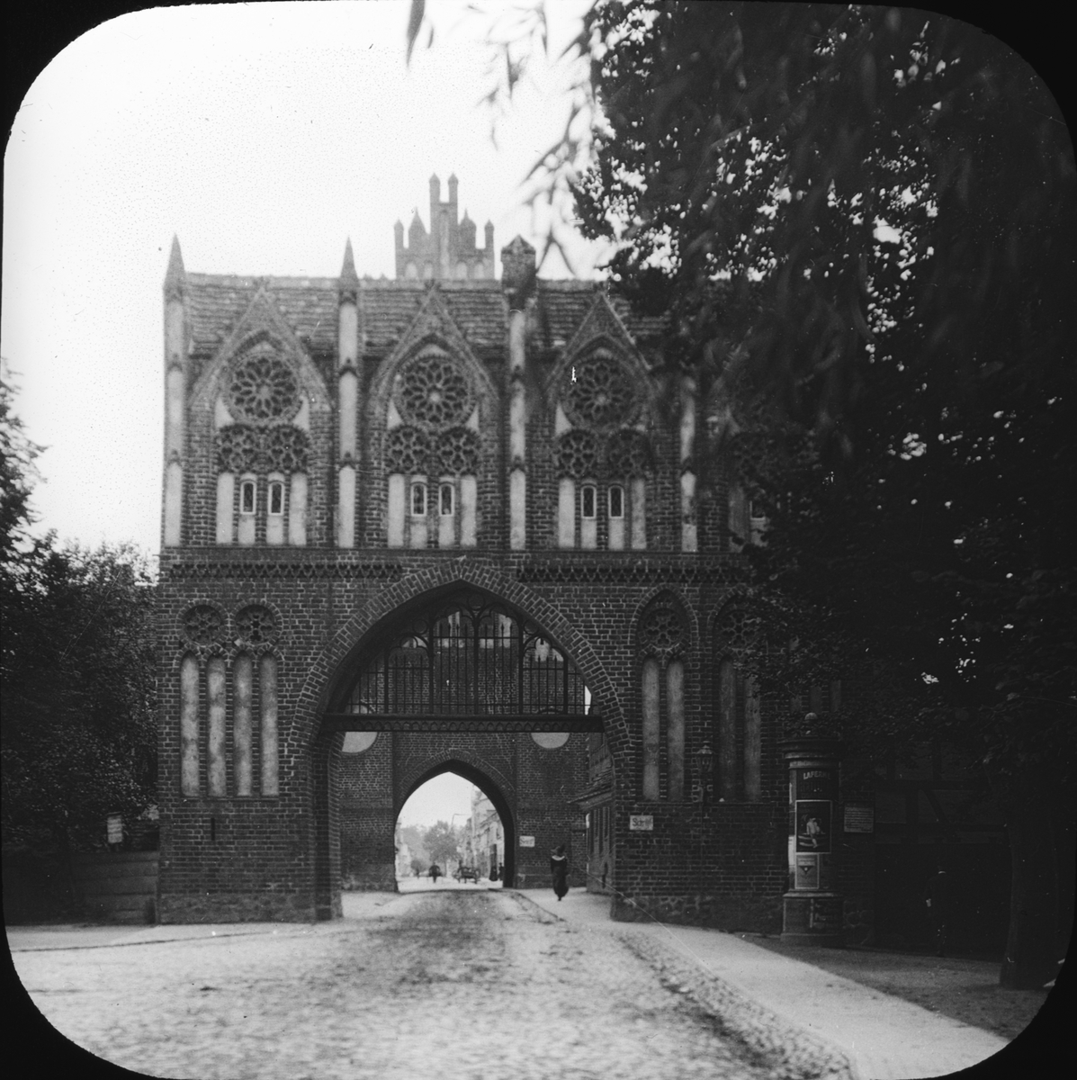Skioptikonbild med motiv av Treptower Tor, port i stadsmuren i Neubrandenburg.