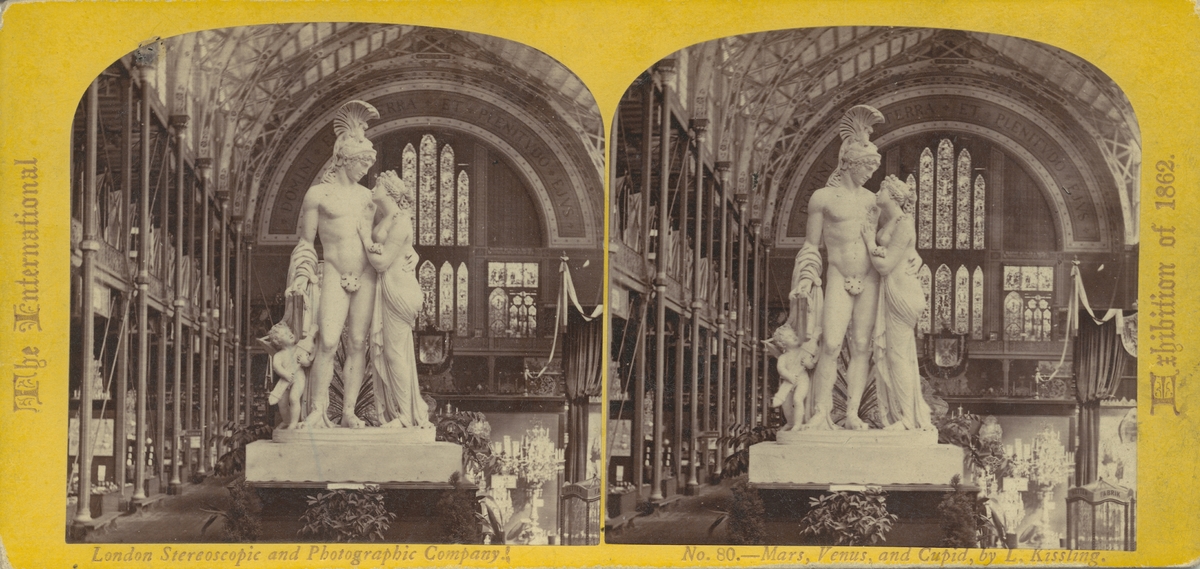 Stereobild med motiv från Allmänna Kont- och Industriutställningen 1862. Skulptur av Mars, Venus och Cupid, utförd av L. Kissling.