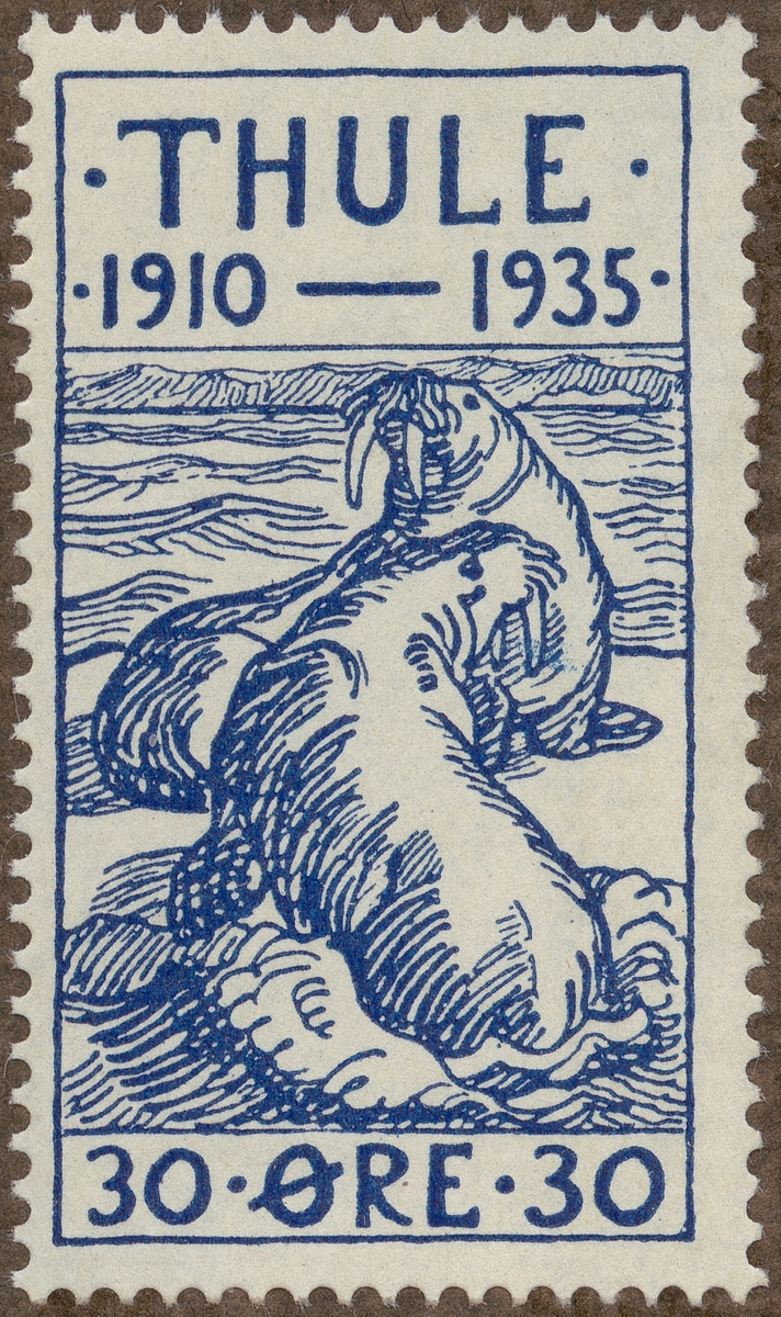 Frimärke från Thule (Grönland), 1936. Motiv av Valrossar Nordvästra Grönland. Kolonien Thule 25 år: 1910-1935. Grundad av danska polarforskaren Knut Rasmussen: (1879-1933) "Thule serien-"