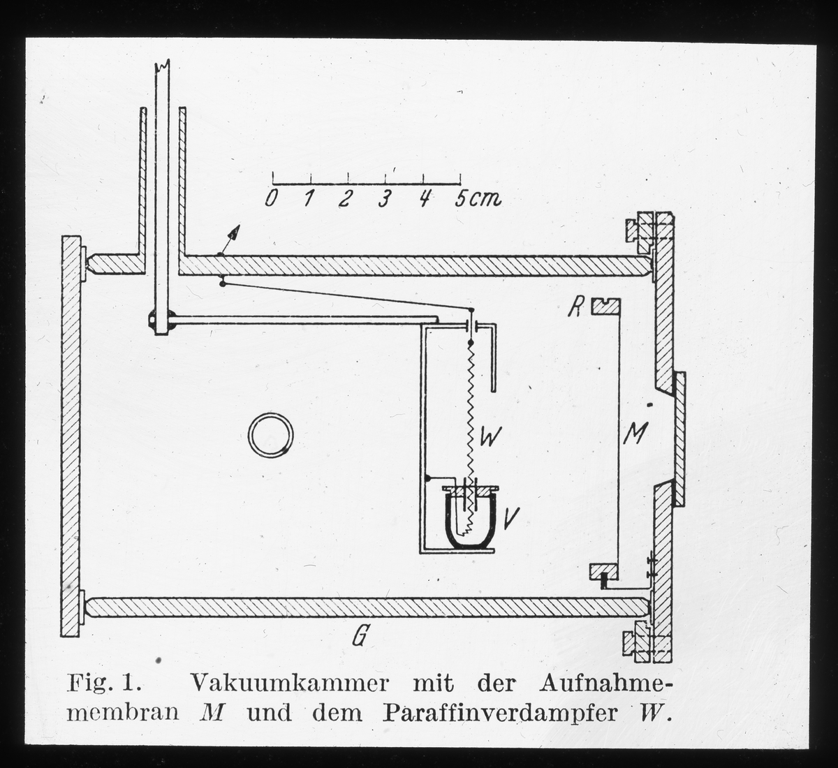 Vakuumkammare med införande membranet M och paraffin förångaren W.