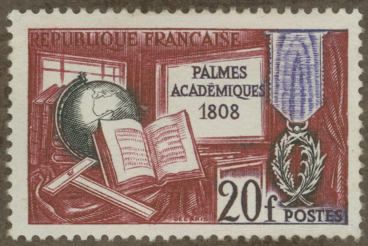 Frimärke från Frankrike, 1958. Motiv av jordglob med mera. Symboler för Franska Vetenskapsakademien. "150-årsminne 1808-1958".