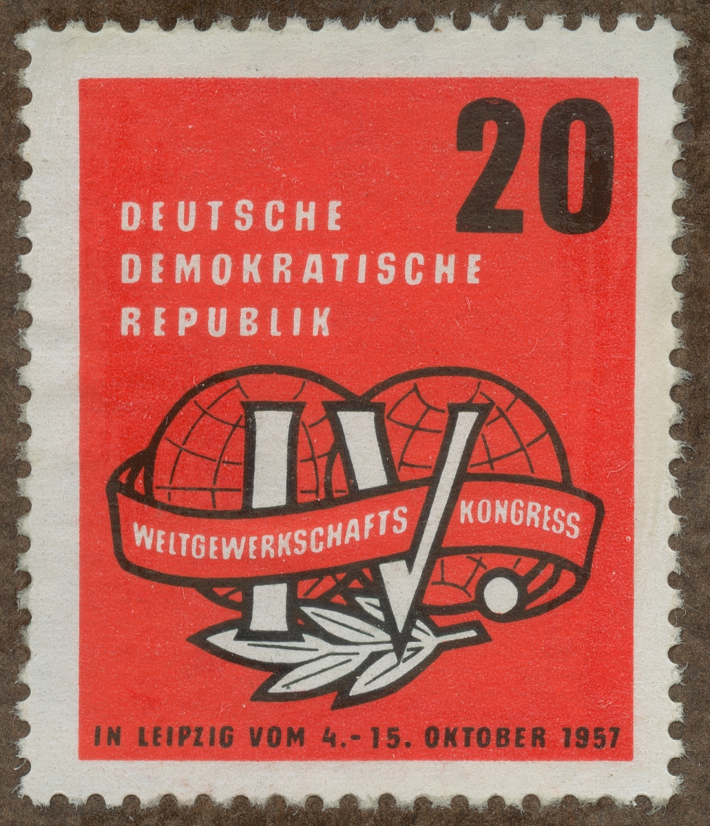 Frimärke från Öst Tyskland, 1957. Motiv av Jordglober 4:d Weltgewerkschafts Kongress Leipzig 4-5 Okt 1957