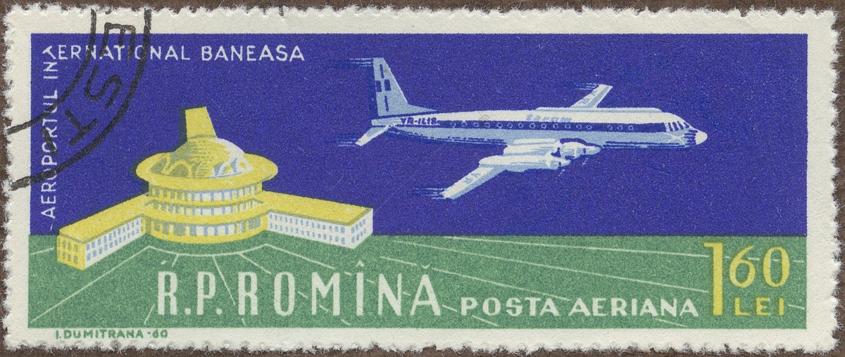 Frimärke från Rumänien, 1960. Motiv av Flygfältet i Baneasa. "Serie. Flygets Dag och 50-års jubileum av första rumänska flyget: 1910-1960."