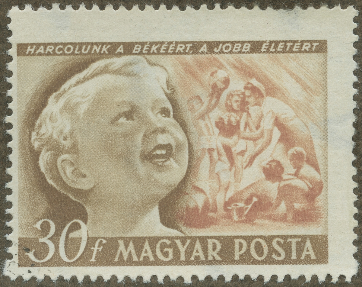 Frimärke ur Gösta Bodmans filatelistiska motivsamling, påbörjad 1950. Frimärke från Ungern, 1950. Motiv av Lekande Barn vid Badstranden "-Serie: Internationella Barnhjälpsdagen-"
