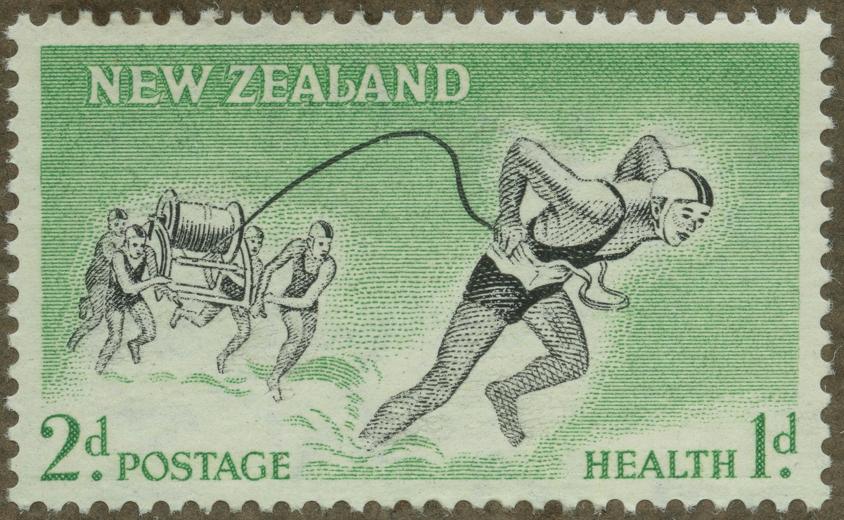 Frimärke från New Zealand, 1957. Motiv av Badräddningslina framdrages