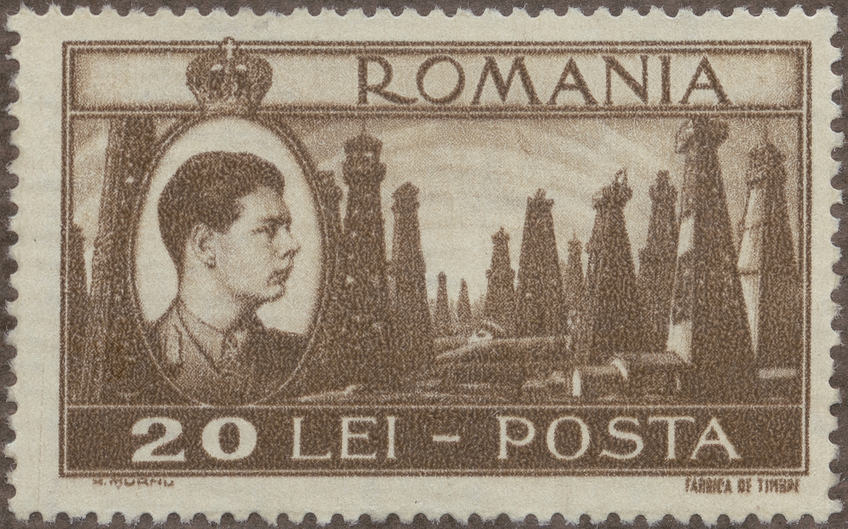 Frimärke från Rumänien, 1947. Motiv av borrtorn för petroleum.