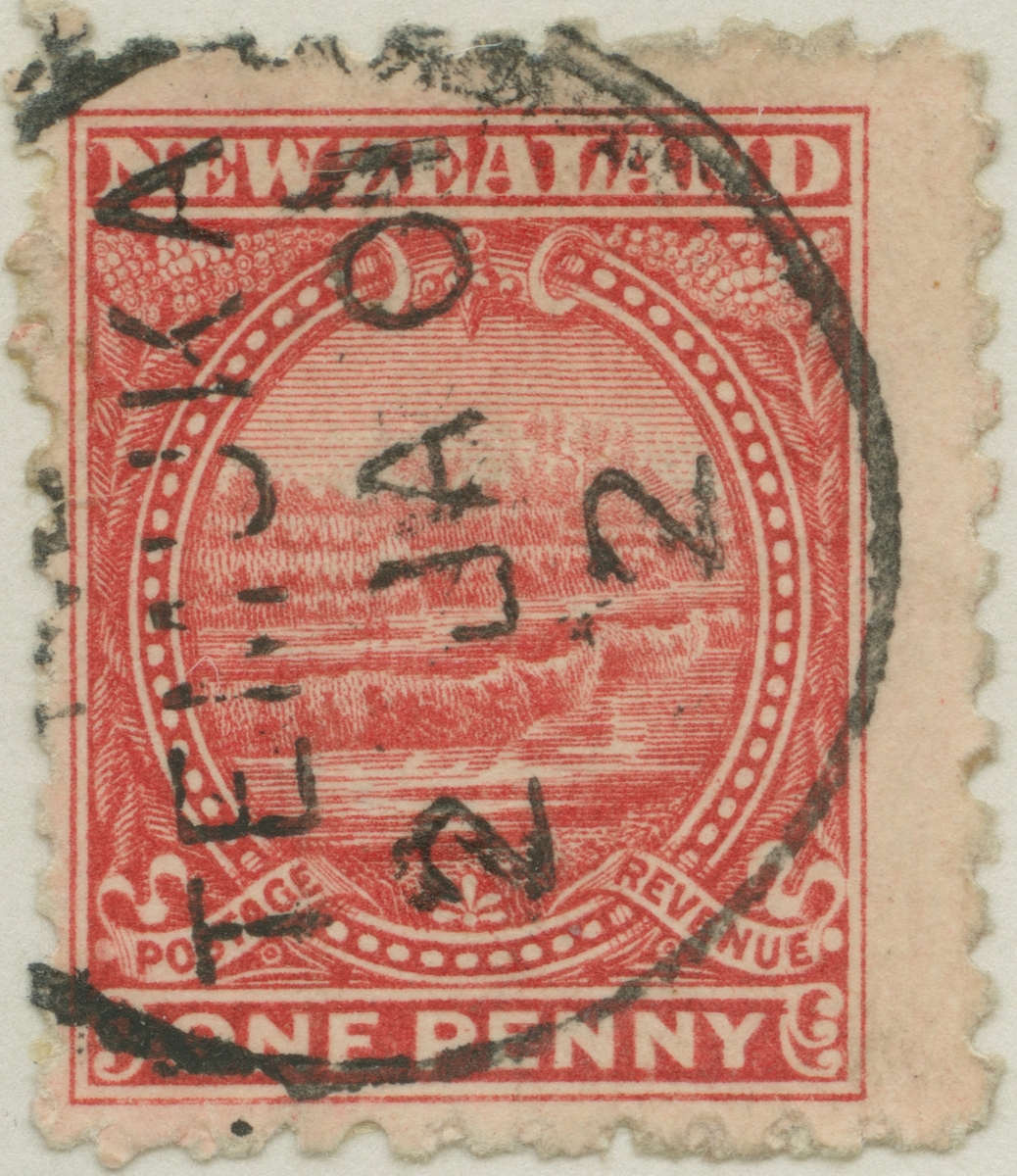 Frimärke ur Gösta Bodmans filatelistiska motivsamling, påbörjad 1950. Frimärke från New Zealand, 1898. Motiv av De skära sinterterrasserna: Rotomahana