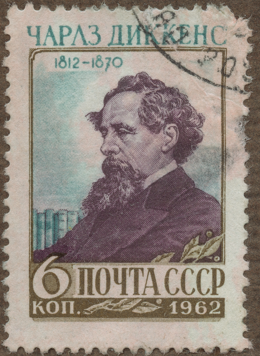 Frimärke från Ryssland, 1962. Motiv av Engelska romanförfattaren Charles Dickens: 1812-1870. Till 150-årsjubileet av hans födelse: 1812-1962