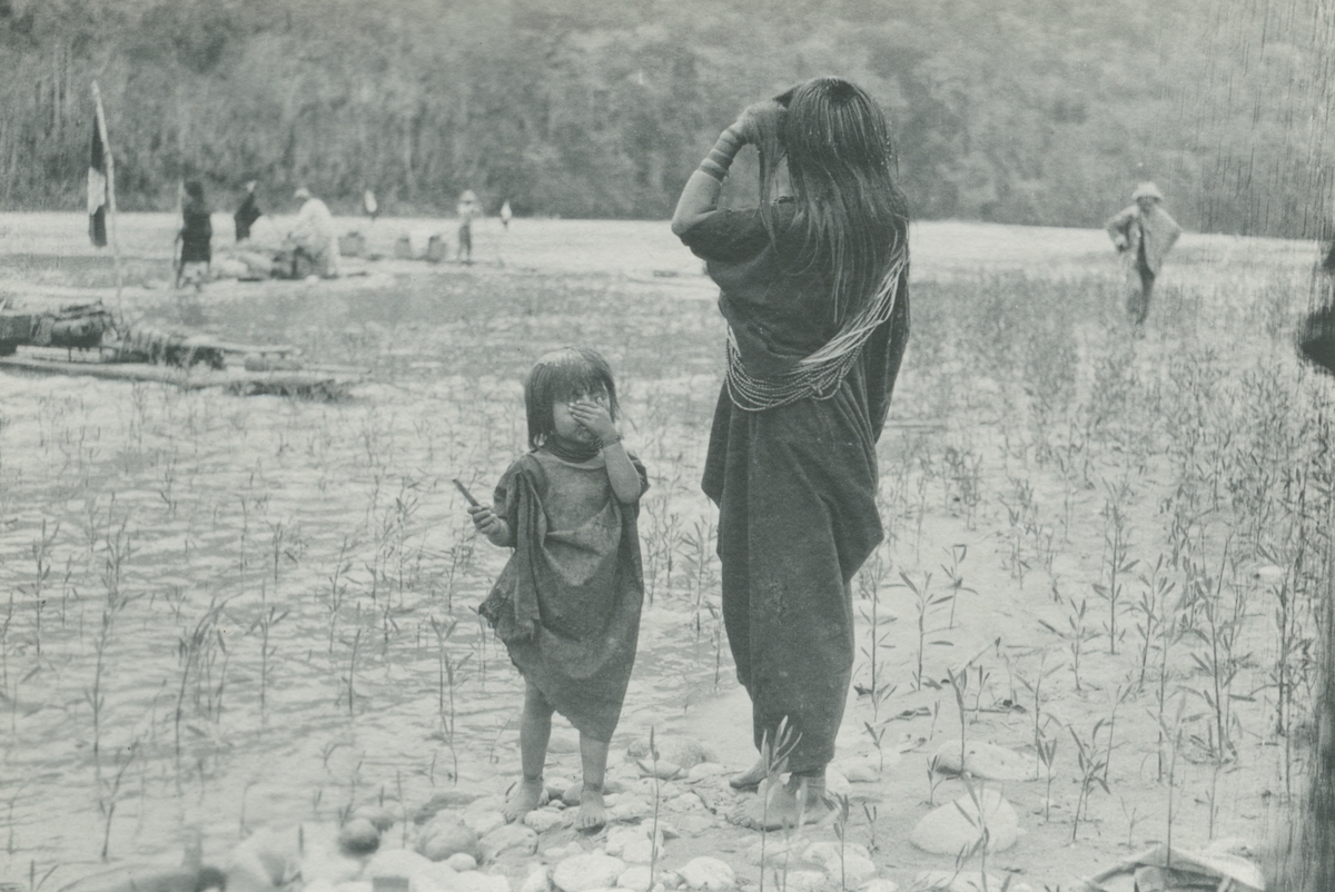 Fotografi från expedition till Peru 1920. Motiv av kvinna och barn på strand vid flod i djungeln.