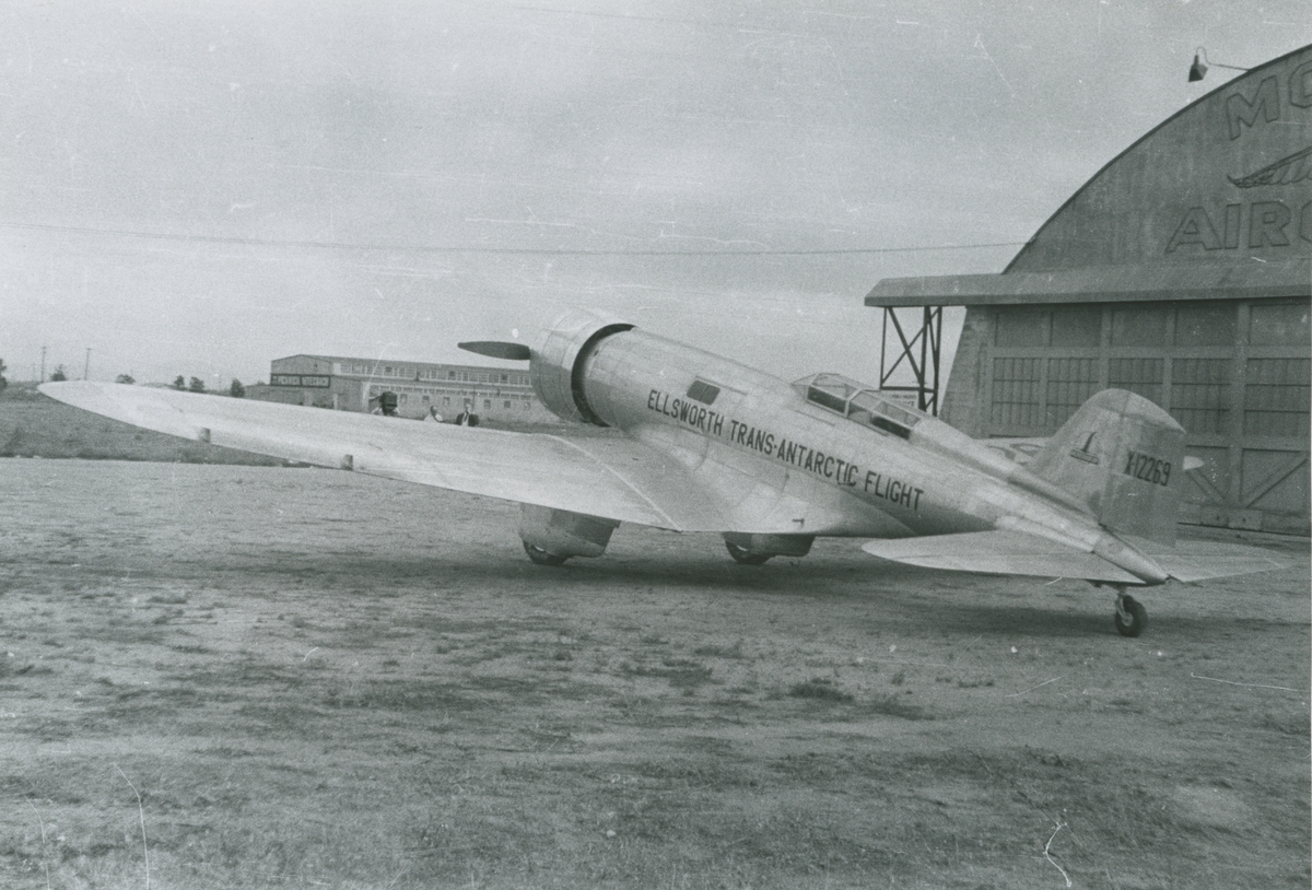 Fotografi från låda märkt Bernt Balchen. Balchen var norsk-amerikansk flygare, polarforskare och militär. Motiv av flygplan utanför flyghangar. På flygplanet står texten: "Ellsworth Trans-Antarctic Flight".