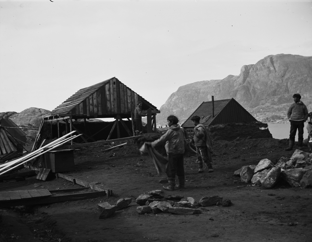 Fotografi från Grönland. Motiv av människor vid trähus.