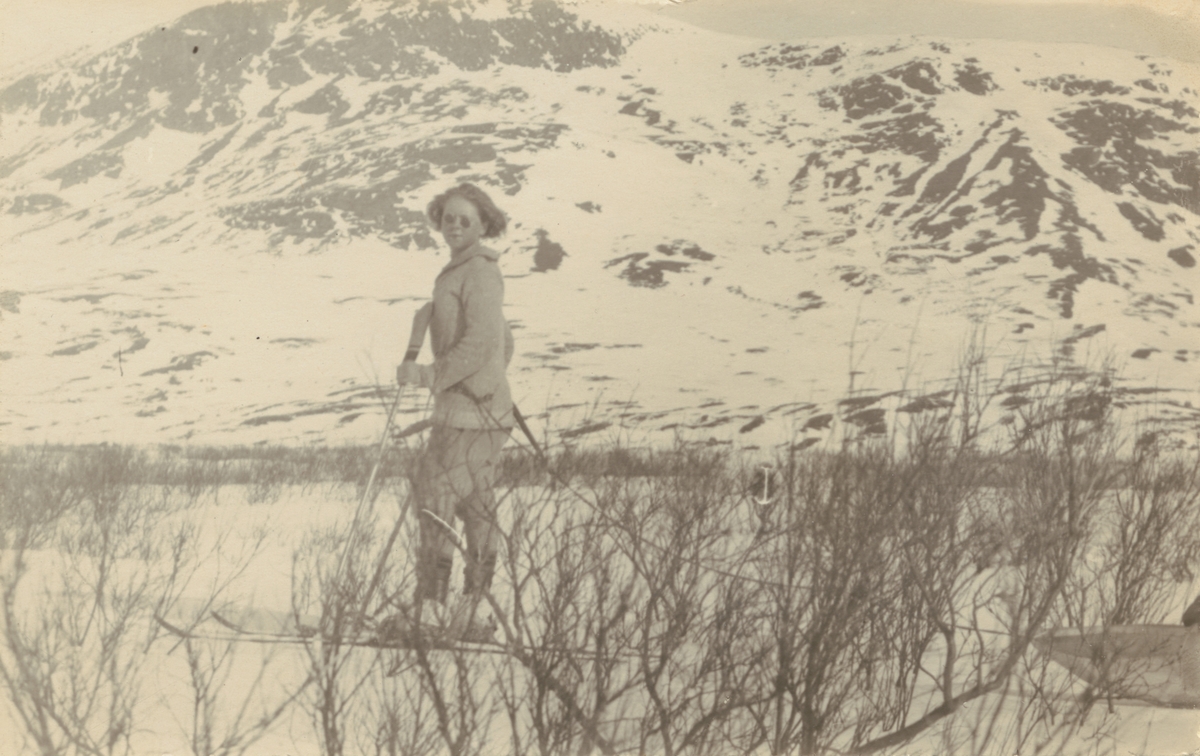 Diverse bilder från Fred Goldbergs samling. Motiv av kvinna i snöigt bergslandskap.