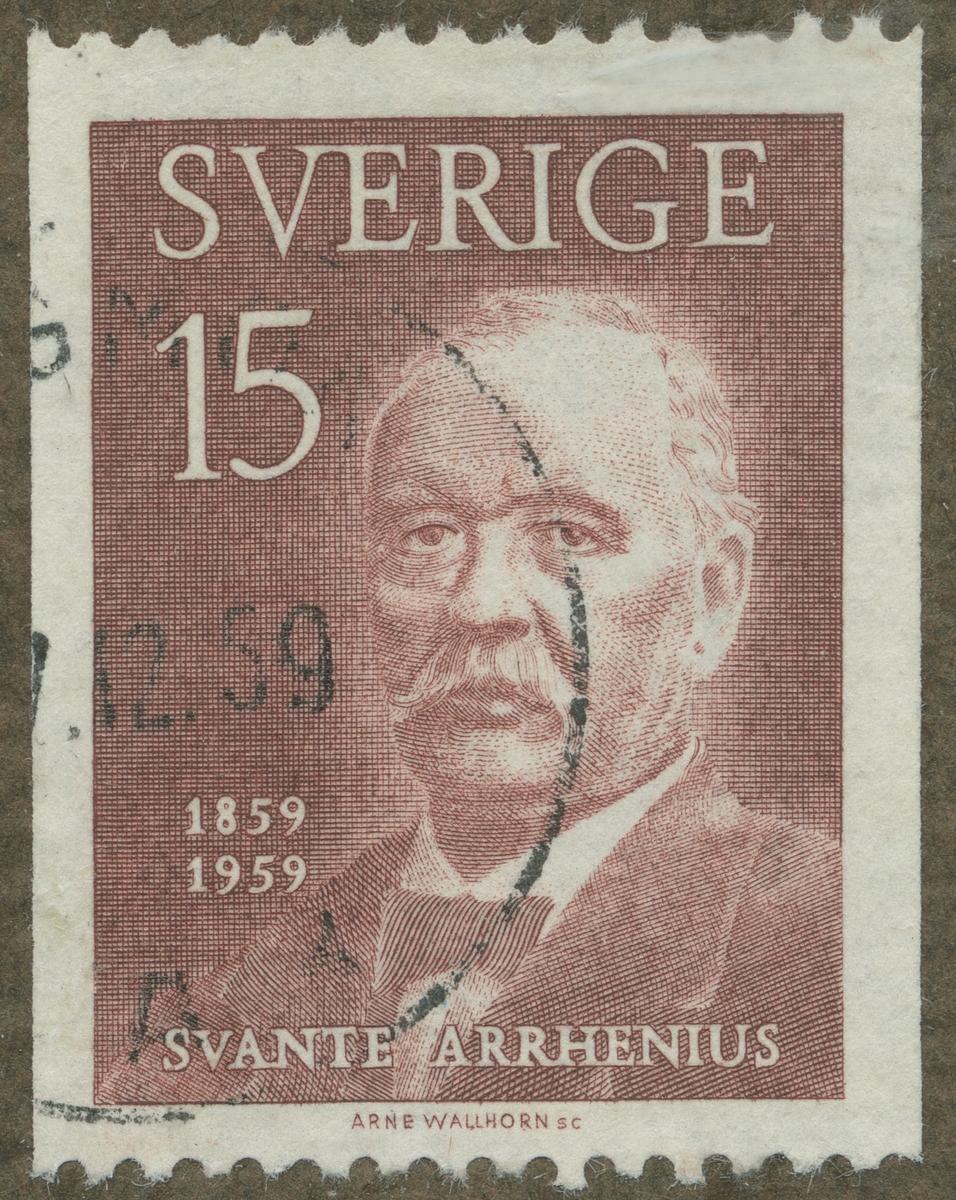 Frimärke från Sverige, 1959. Motiv av Svante Arrhenius 1859-1927 Kemist Dissociationsteorien Nobelpristagare 1903. 100-årsminne av födelse 1859-1959.