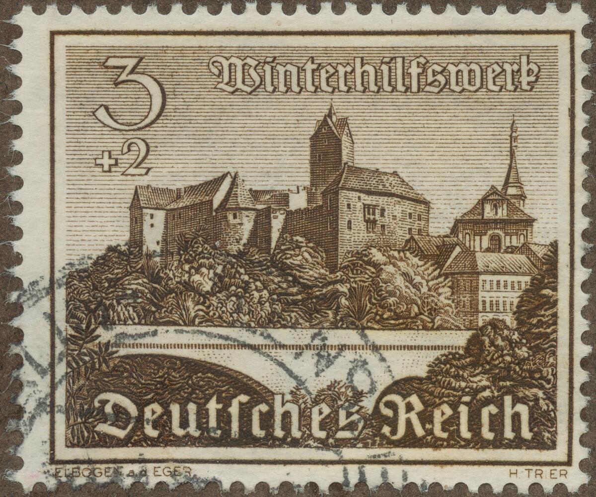 Frimärke från Tyskland, 1939. Motiv av Slottet Elbogen "-Serie: Vinterhjälpen-"