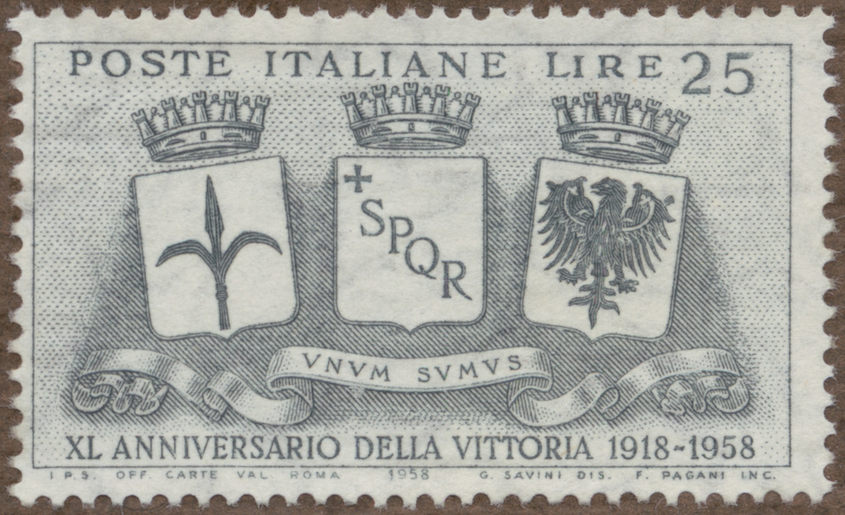 Frimärke från Italien, 1958. Motiv av Tre italienska vapen 40-års minne av segern 1918