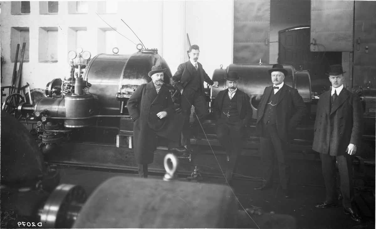I förgrunden fem ståtliga herrar (tjänstemän) i bakgrunden en turbin.