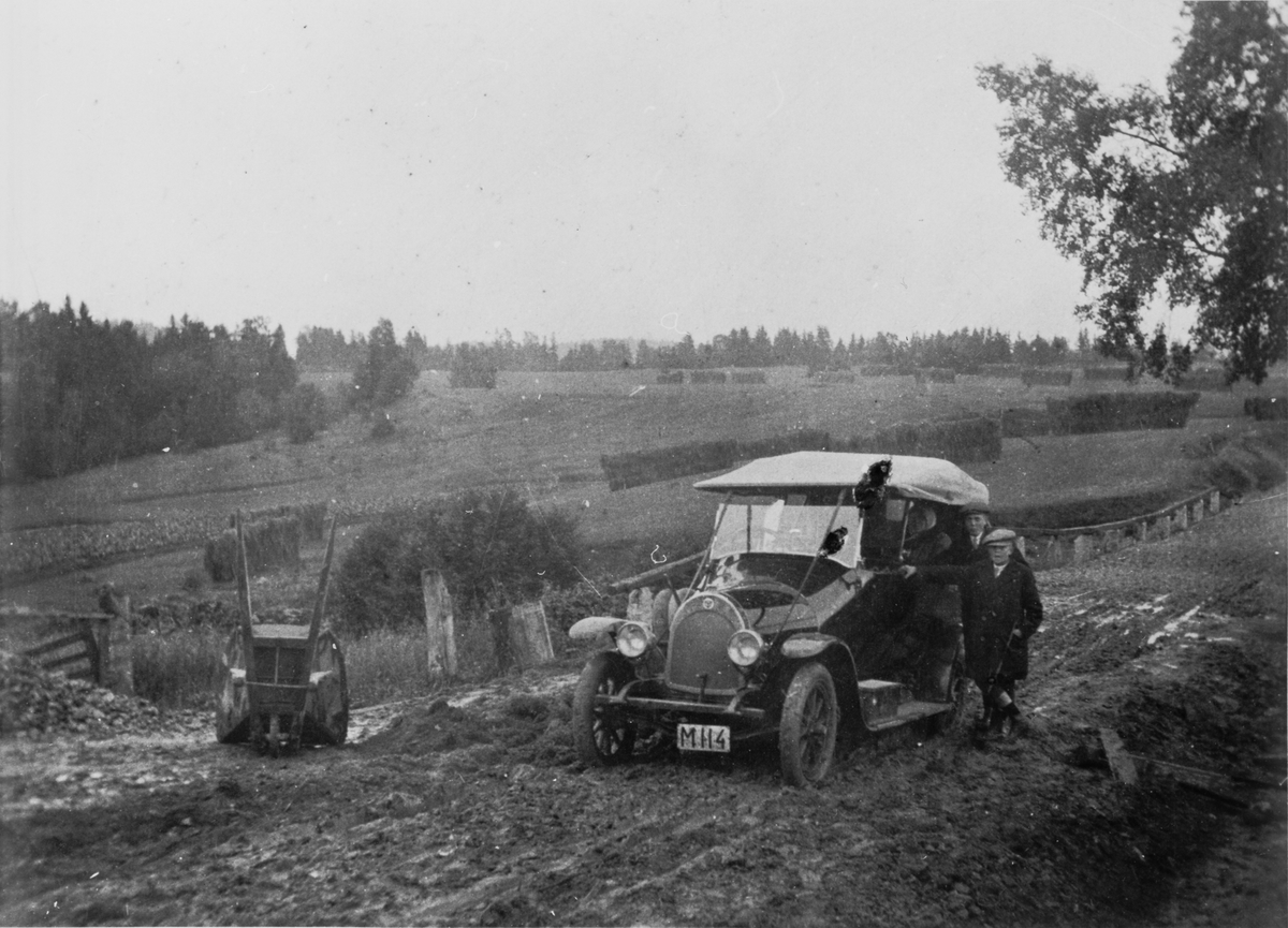 Scania "Perry", 1916. Ekipage som kört fast i Smålandsgyttja. Men bättre brödlös än rådlös. Två dragare upplånades och sedan de gjort sitt kunde den avbrutna färden fortsätta.