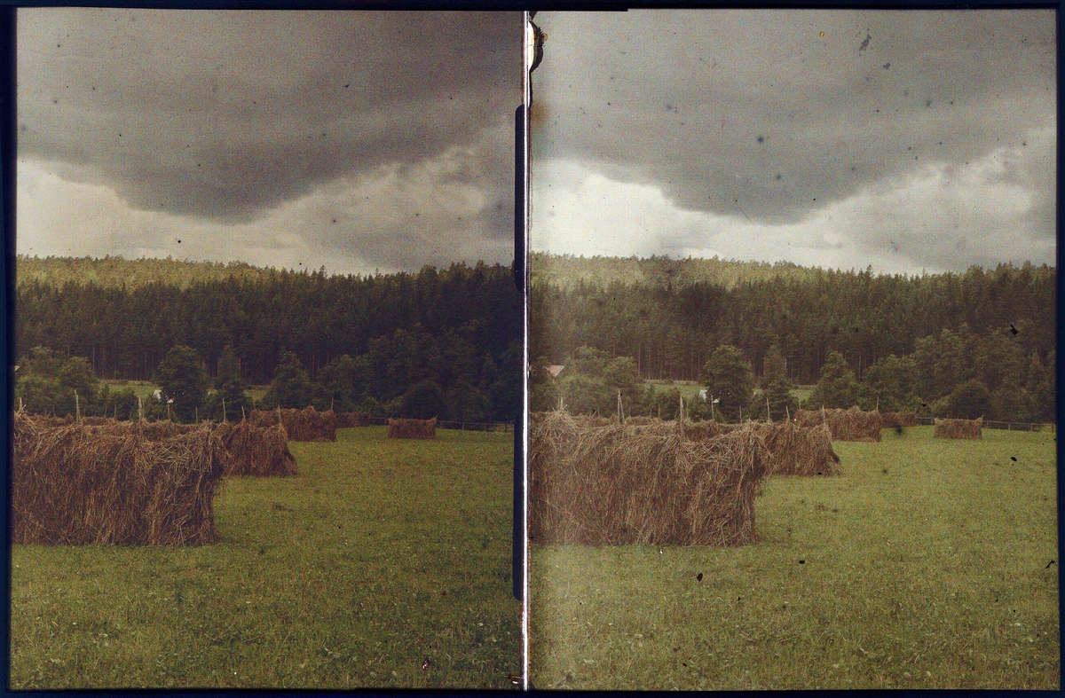 Lumières-stereo-autokromer. Getå-landskap. Gärde med hässjor.