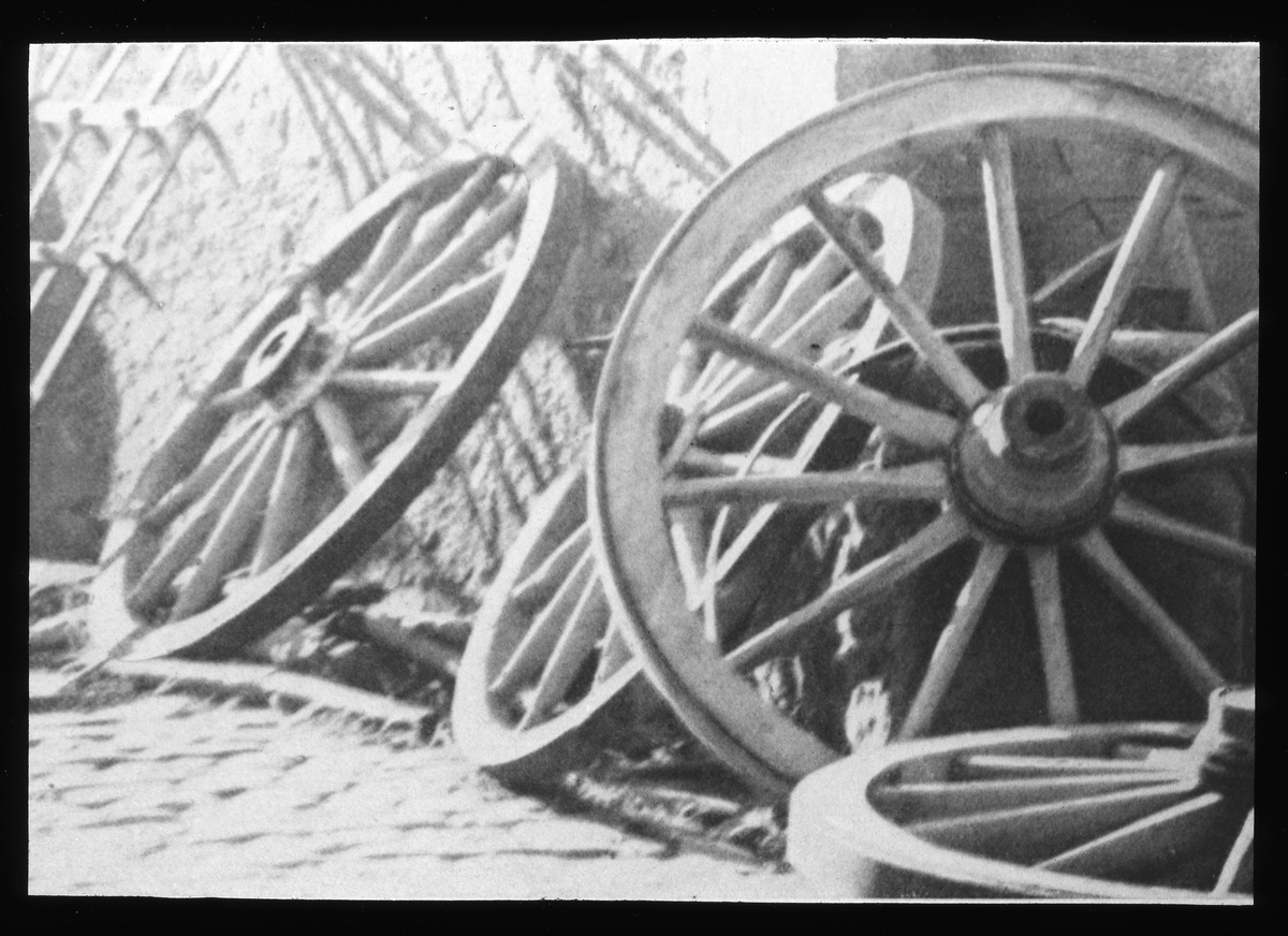 Skioptikonbild från institutionen för fotografi vid Kungliga Tekniska Högskolan. Använd av professor Helmer Bäckström som undervisningsmaterial. Bäckström var Sveriges förste professor i fotografi vid Kungliga Tekniska Högskolan 1948-1958. Hjul. Bilden är en reproduktion.
