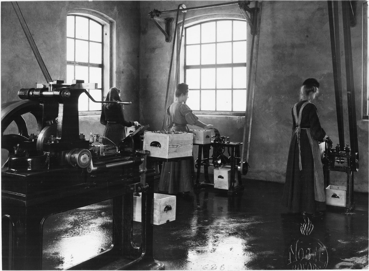 AB Bofors Nobelkrut. Omladdning av mauserpatroner. Till vänster en stukmaskin som pressar ihop hylsorna till sin ursprungliga storlek. Vid skottlossningen utvidgas de alltid något. Övriga maskiner kontrollmäter de stukade hylsorna och kasserar dem som inte håller måttet.