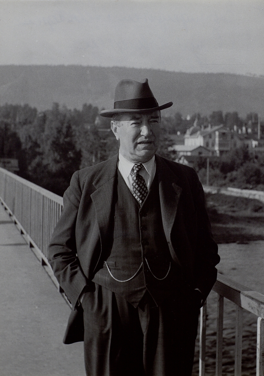 Arvid Holmgren, överingenjör i Telegrafstyrelsen. Stående på bron över Ångermanälven i Sollefteå vid tiden för stationens projektering. Bilden tagen av Hans Björk.