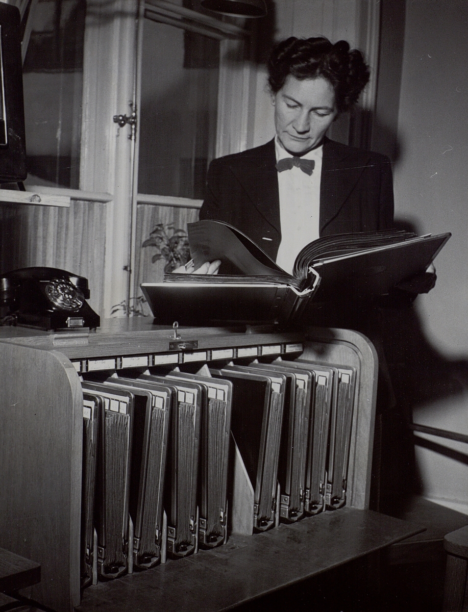 Fru Jensen på Undervisningsanstalten 1945 med kortregister för Hermodselever.