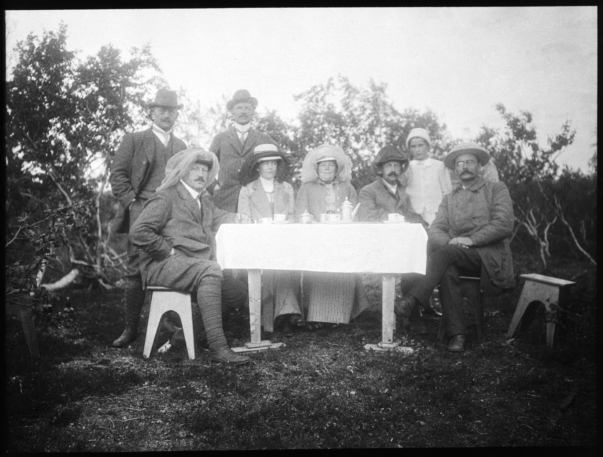 Kvinnor och män dricker kaffe ute i det gröna. (Sittande tvåa från höger Albert de Perre).