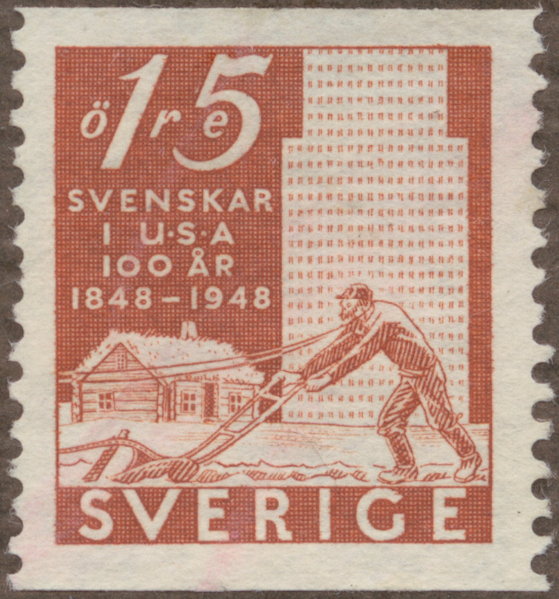 Frimärke från Sverige, 1948. Motiv av Plöjande av nymark Stuga och skyskrapa 100-årsminne av den första svenska emigrationen till U.S.A. 1848-1948.
