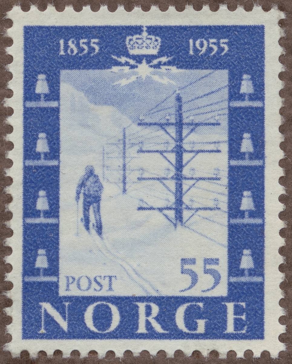 Frimärke ur Gösta Bodmans filatelistiska motivsamling, påbörjad 1950. Frimärke från Norge, 1955. Motiv av Snöhinder vid telegrafledning "Telegrafen i Norge 100 år"